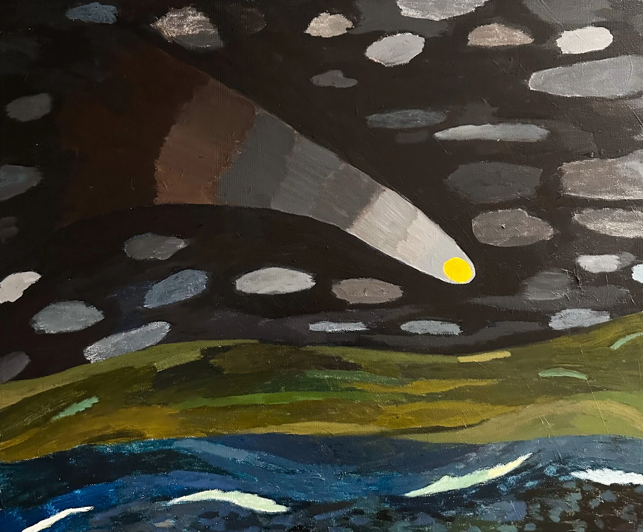 Becoming increasingly more invested in how to use paint as a language, Shindler uses luster and opacity to depict weather shifts, ocean waves and crawling mountains. And in a few scaled up canvases, Shindler was able to address the magnitude of encountering the sublime nature of the landscape, pushing the viewer to feel small in front of the canvas as one would feel in the vast hills and valleys of upstate NY.