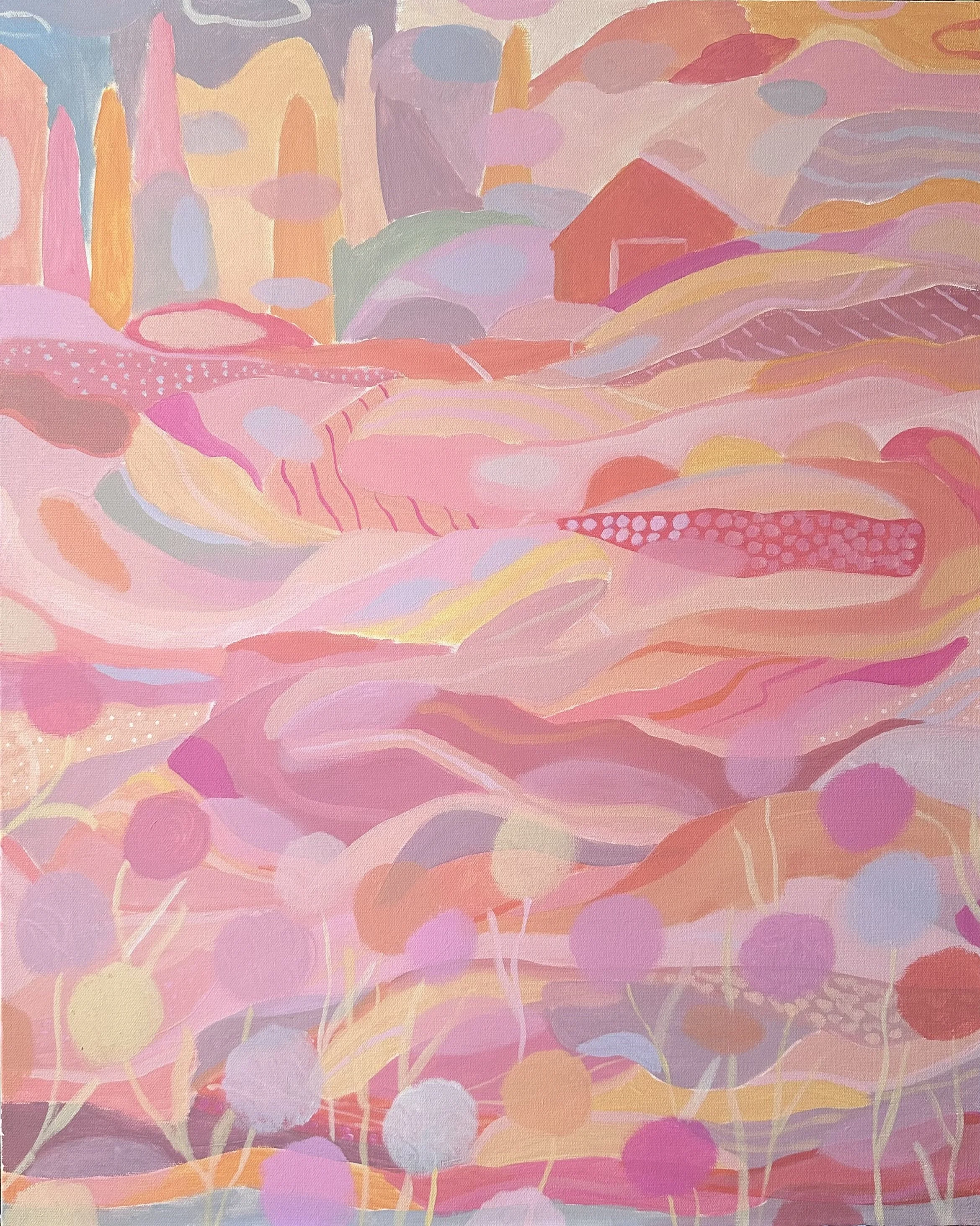 It took a few years, but these new surroundings found its way fully into her studio. The paintings became more about the shapes, textures and colors around her, and her striving to reflect the abstract in the landscape and the repetitions in the mountains and farmland. These patterns, with their movement and emotionality, reminded her of music.