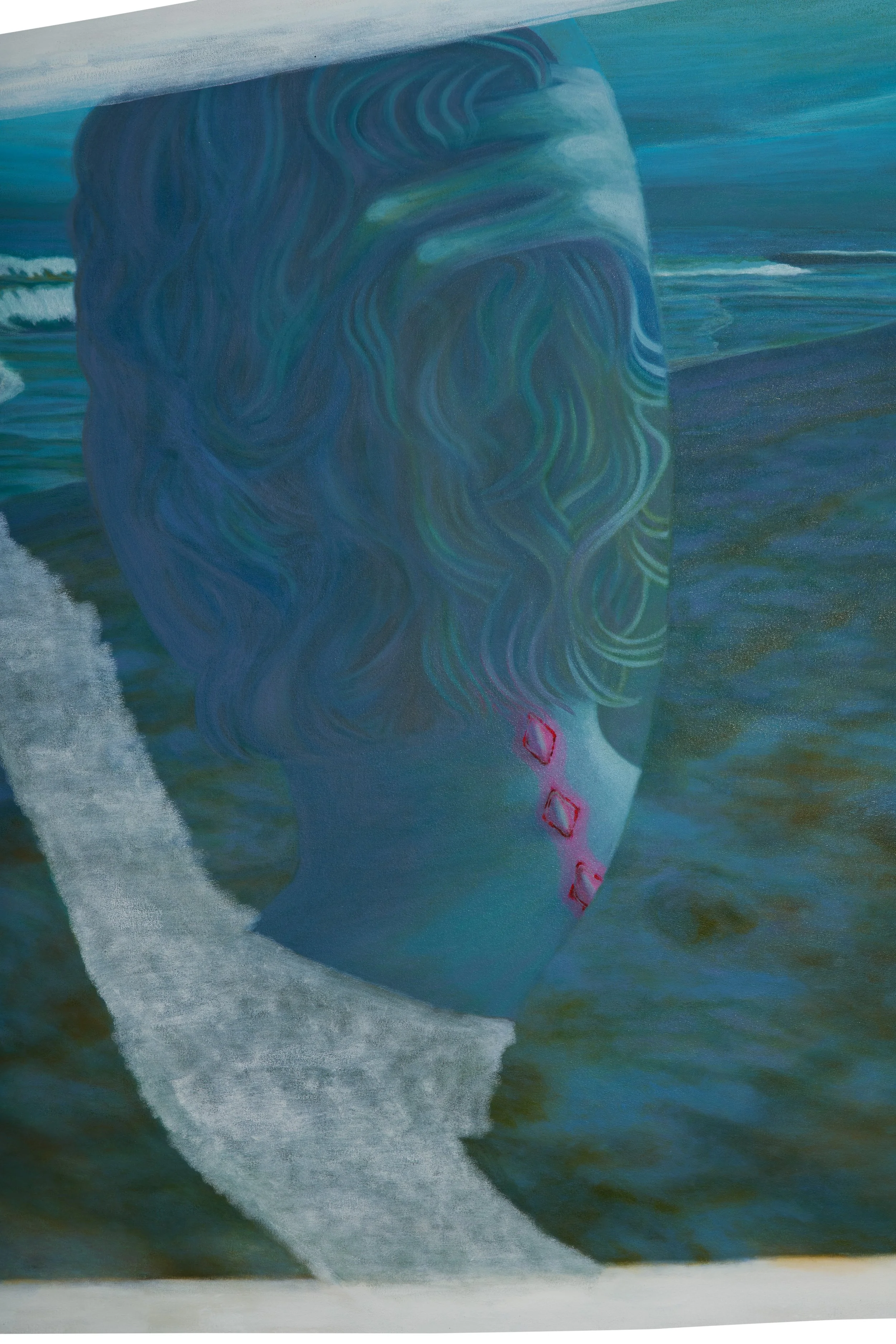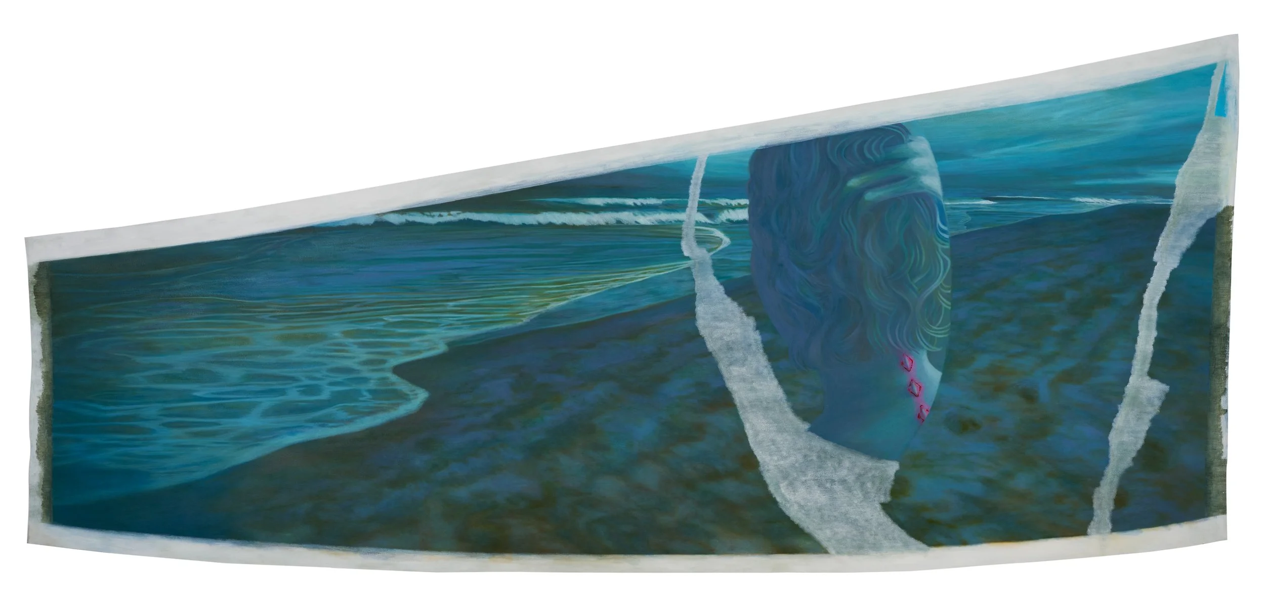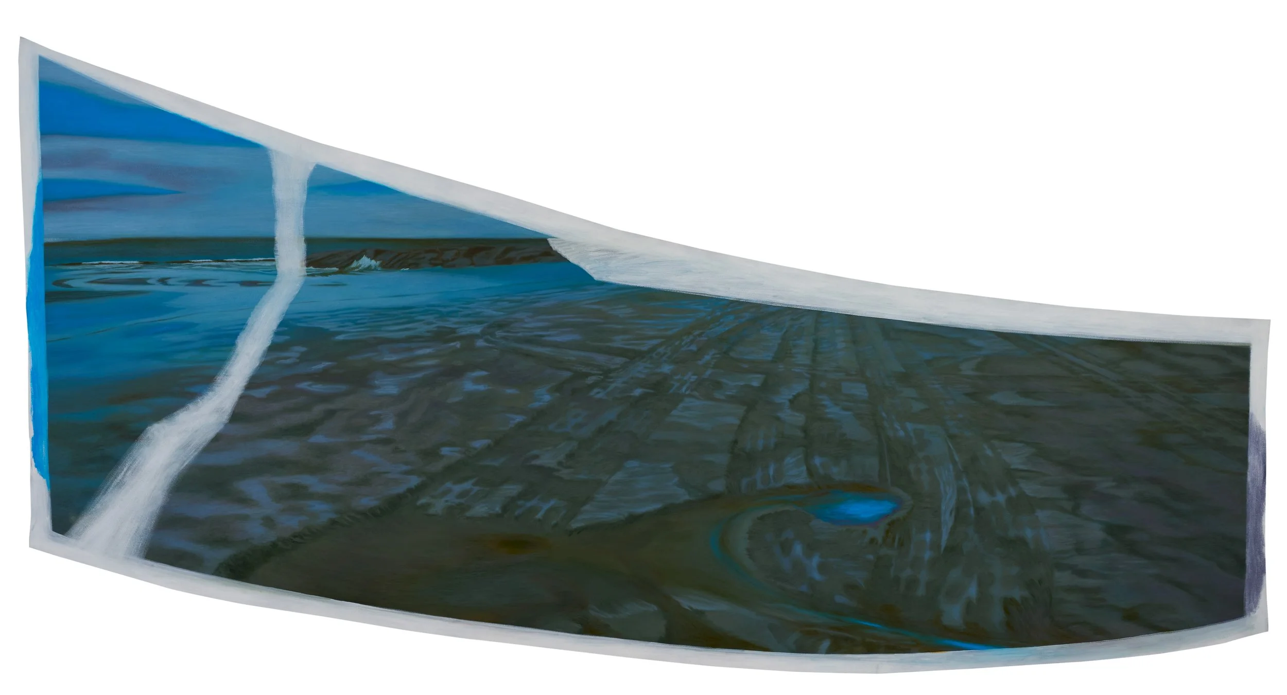 In the spirit of these genres, she uses this process to suggest that perceived reality is like the surface of a river with hidden currents moving beneath. Bilhartz creates deliberately confounding images where invisible layers of colors and marks structure the visible surface. Ambiguity reigns. Cropping obscures the story that unfolds out of frame. What caused that impression in the sand? Whose hand is resting on a rock? Why is the figure transparent?